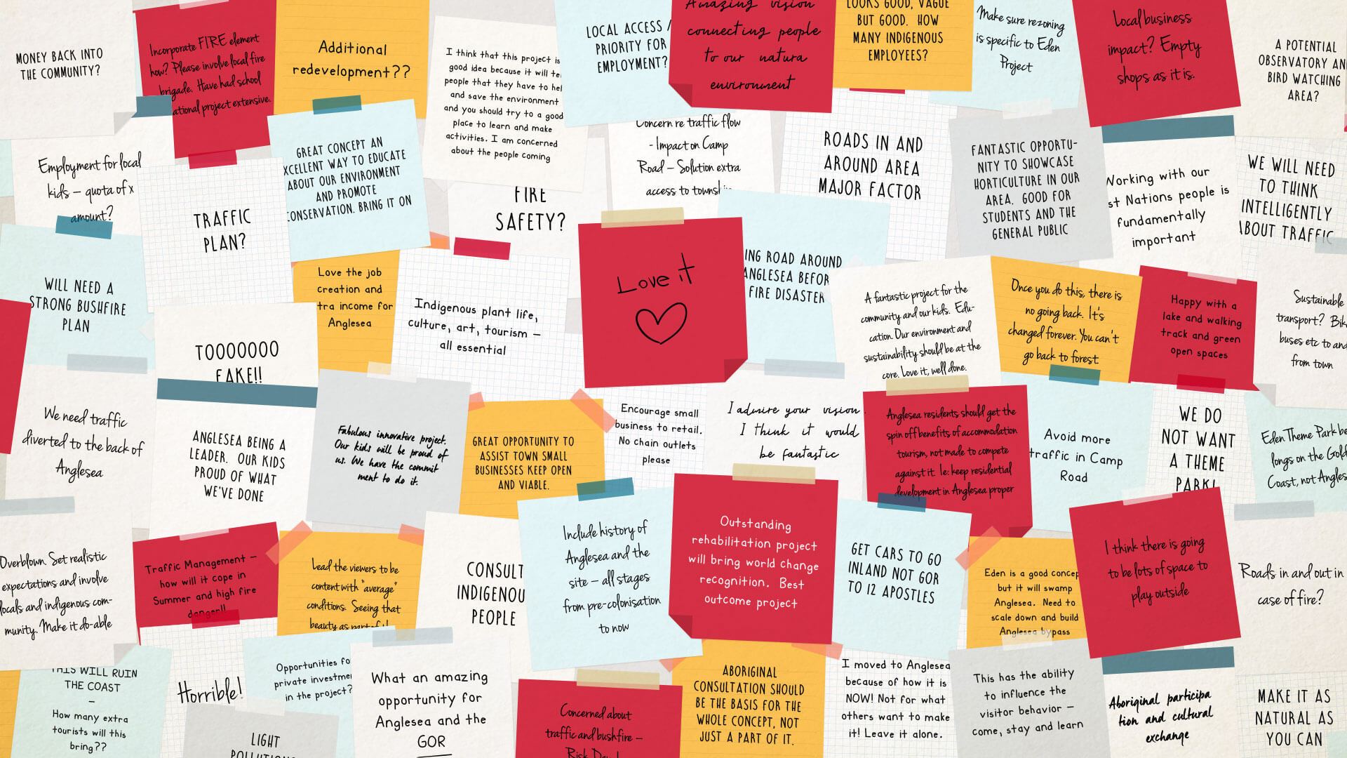 215 post-it note comments were provided during the two community drop-in sessions whereby attendees were encouraged to share questions, concerns, ideas and feedback. You can view a transcription of all post-it notes received here.